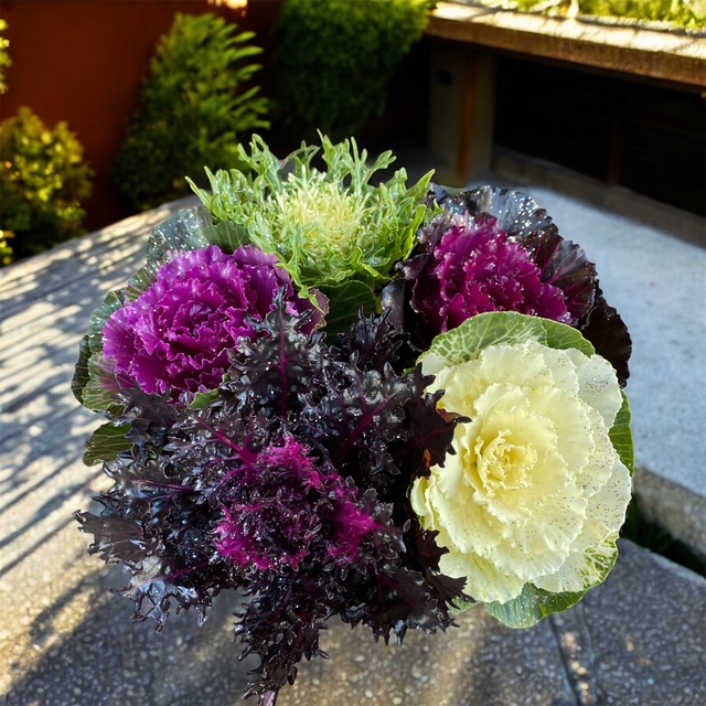 光沢もあり、ラメの効果でピカピカしている葉牡丹(ミツコシリーズ)の寄せ植え入荷しました